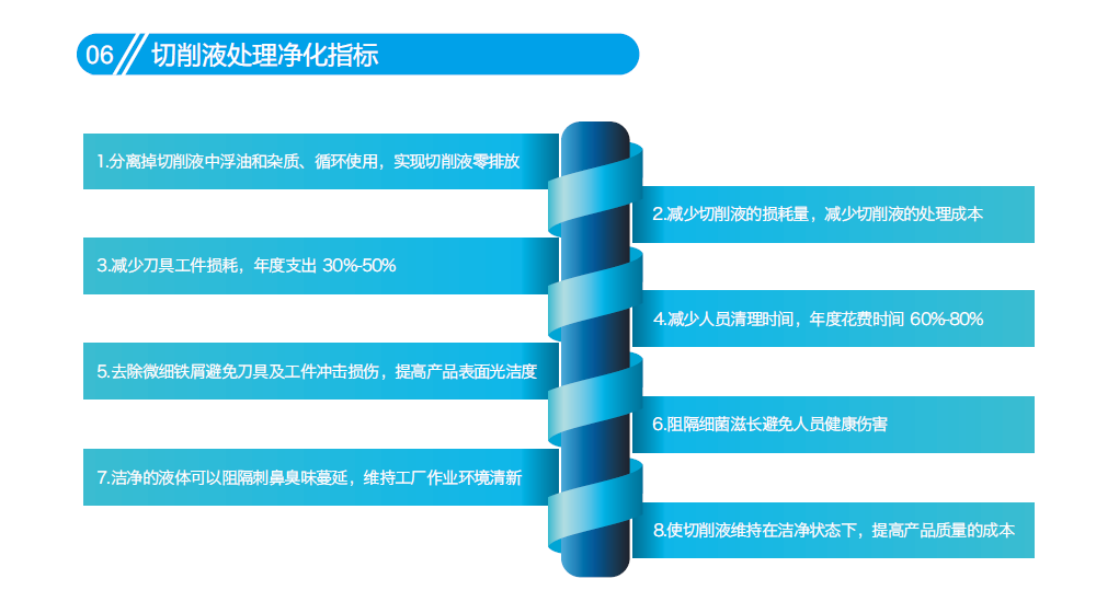1.分离掉切削液中浮油和杂质、循环使用,实现切削液零排放