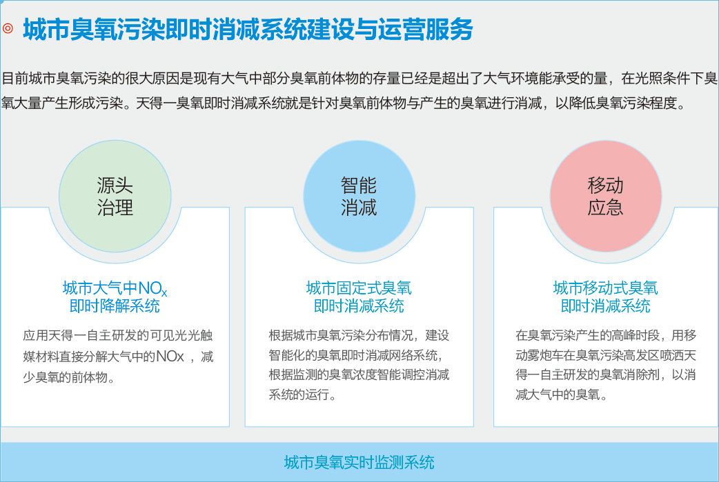 1.城市臭氧污染即时消减系统建设:目前城市臭氧污染的很大原因是现有大气中部分臭氧前体物的存量已经是超出了大气环境能承受的量,在光照条件下臭氧大量产生形成污染。UED·(中国区) - 官网臭氧即时消减系统就是针对臭氧前体物与产生的臭氧进行消减,以降低臭氧污染程度。