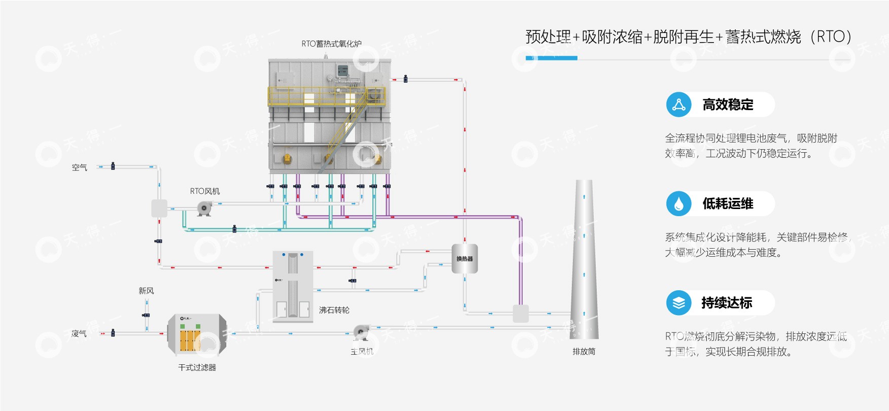 推荐治理方案:预处理 + 吸附浓缩 + 脱附再生 + 蓄热式燃烧(RTO),首先对废气进行针对性预处理,去除其中的颗粒物与水汽,确保后续系统稳定运行;采用定制化的活性炭或分子筛复合吸附材料,高效捕集各工序分散产生的低浓度 VOCs,实现废气的有效浓缩;吸附饱和后,系统通过精准控制的热空气进行脱附,将低浓度废气转化为小风量、高浓度的有机气流。该气流随后导入蓄热式燃烧装置(RTO),在高温下彻底氧化分解为二氧化碳与水,实现无害化排放。本方案兼具高效性与经济性,系统全程自动化运行,在确保稳定达标的同时,显著降低运行能耗与维护成本。