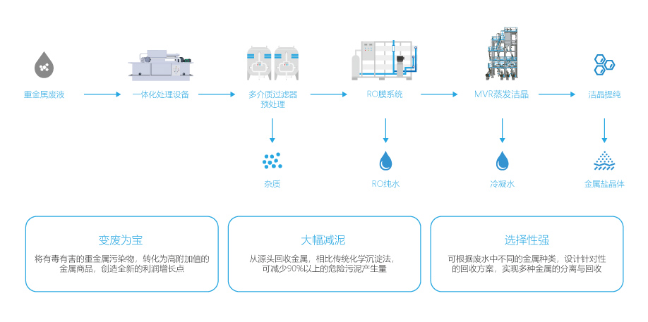 在电镀、电子元件、冶金、化工及印刷电路板(PCB)等工业领域,重金属废水(含铬、镍、镉、铜、锌、铅等)因毒性强、难降解、易富集,被称为“工业毒水”。传统处理工艺多依赖化学沉淀、中和等手段,虽能实现达标排放,却面临三大痛点:重金属资源浪费(每年超百万吨有价金属随废水流失)、污泥产量大(吨废水产泥0.5-2吨,综合处置成本占比超40%)、二次污染风险(污泥随意堆存或简易填埋导致土壤/地下水污染)。重金属废水资源化及污泥减排系统以“精准回收+深度减量化”为核心,通过“膜分离+蒸发”协同技术,将废水中的重金属从“污染物”转化为“资源”,同时实现污泥产量降低60%-80%,助力企业破解“治污成本高、资源流失多、环境风险大”的困局。