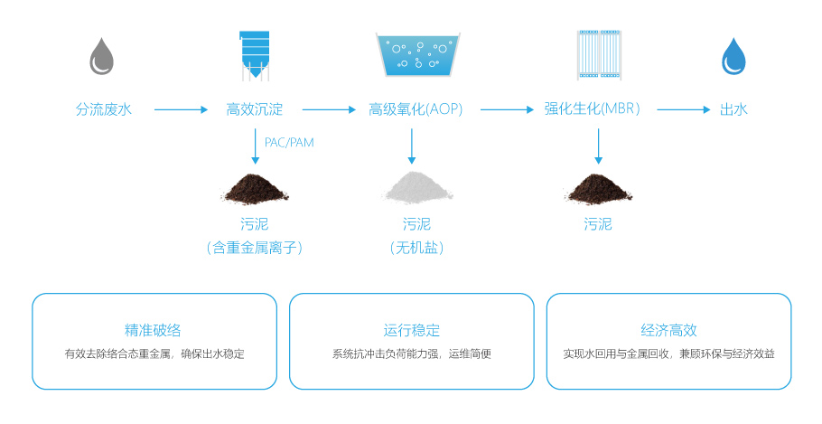 分质预处理系统: 将络合、综合、有机等废水从源头分类,进行针对性破络、破氰等预处理。